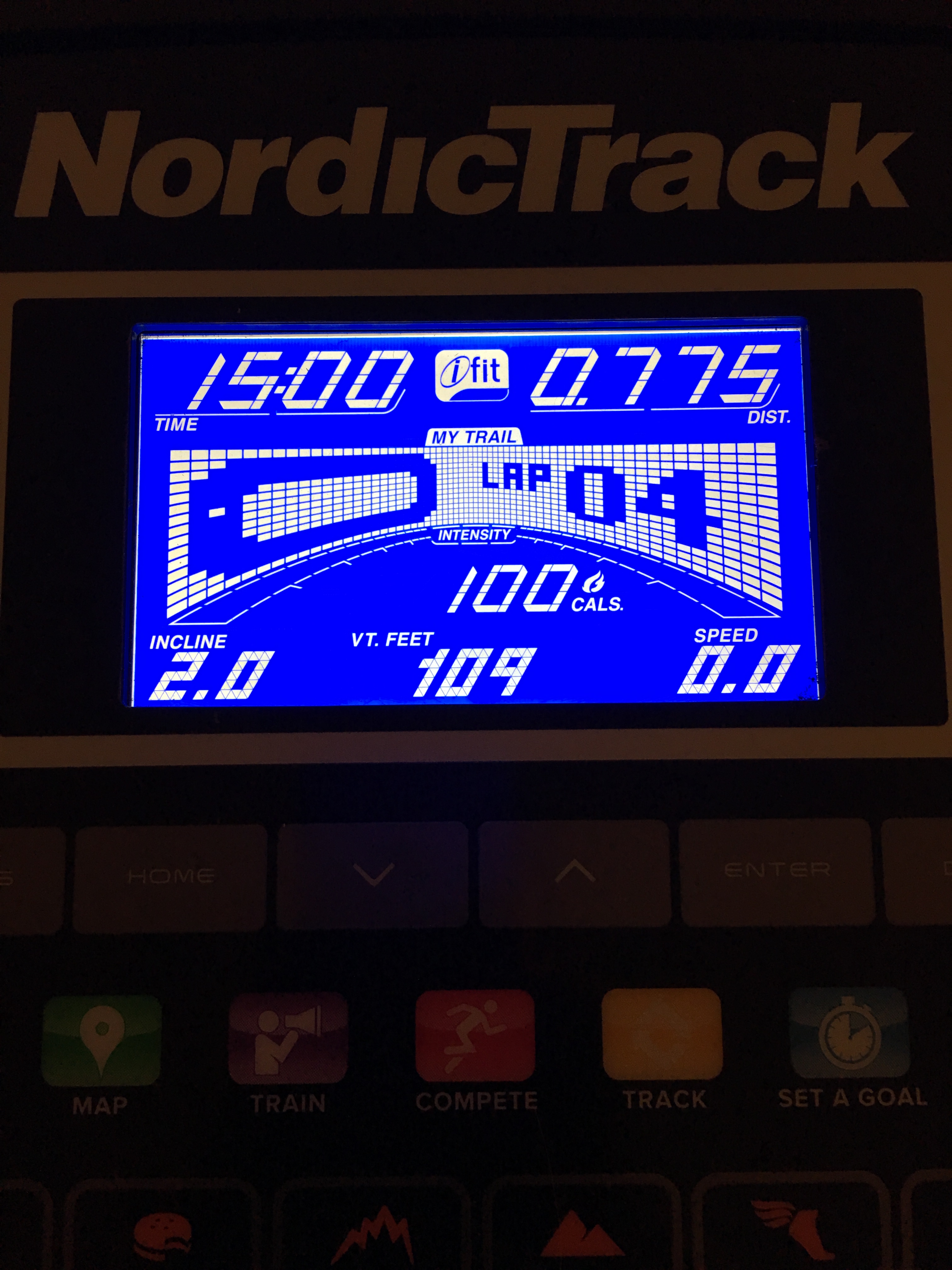 I normally do at least 30 minutes with much more vertical feet than this, but I didn’t want to raise my core temperature too much, or stress myself out too much, so just 15 minutes this time.