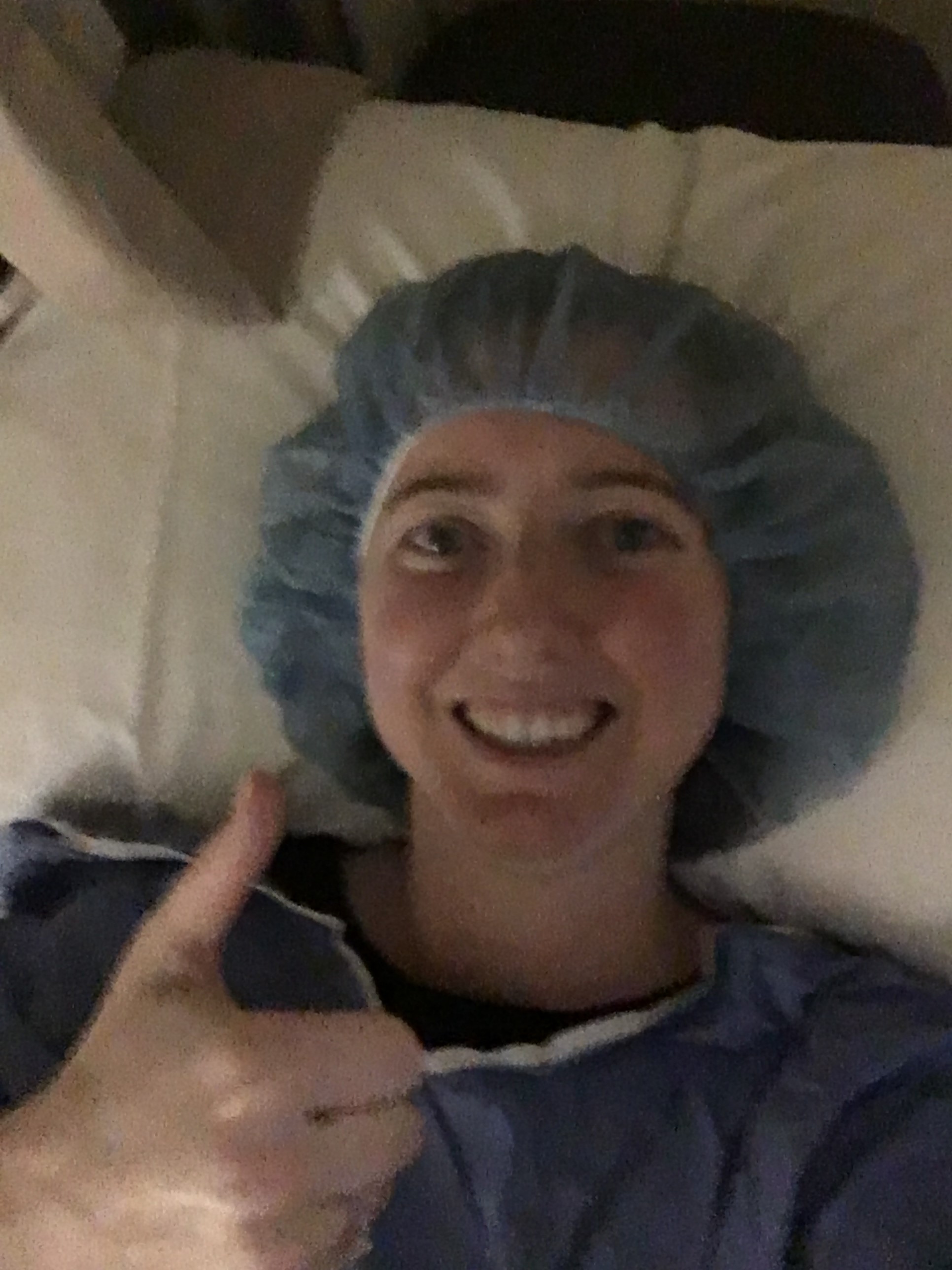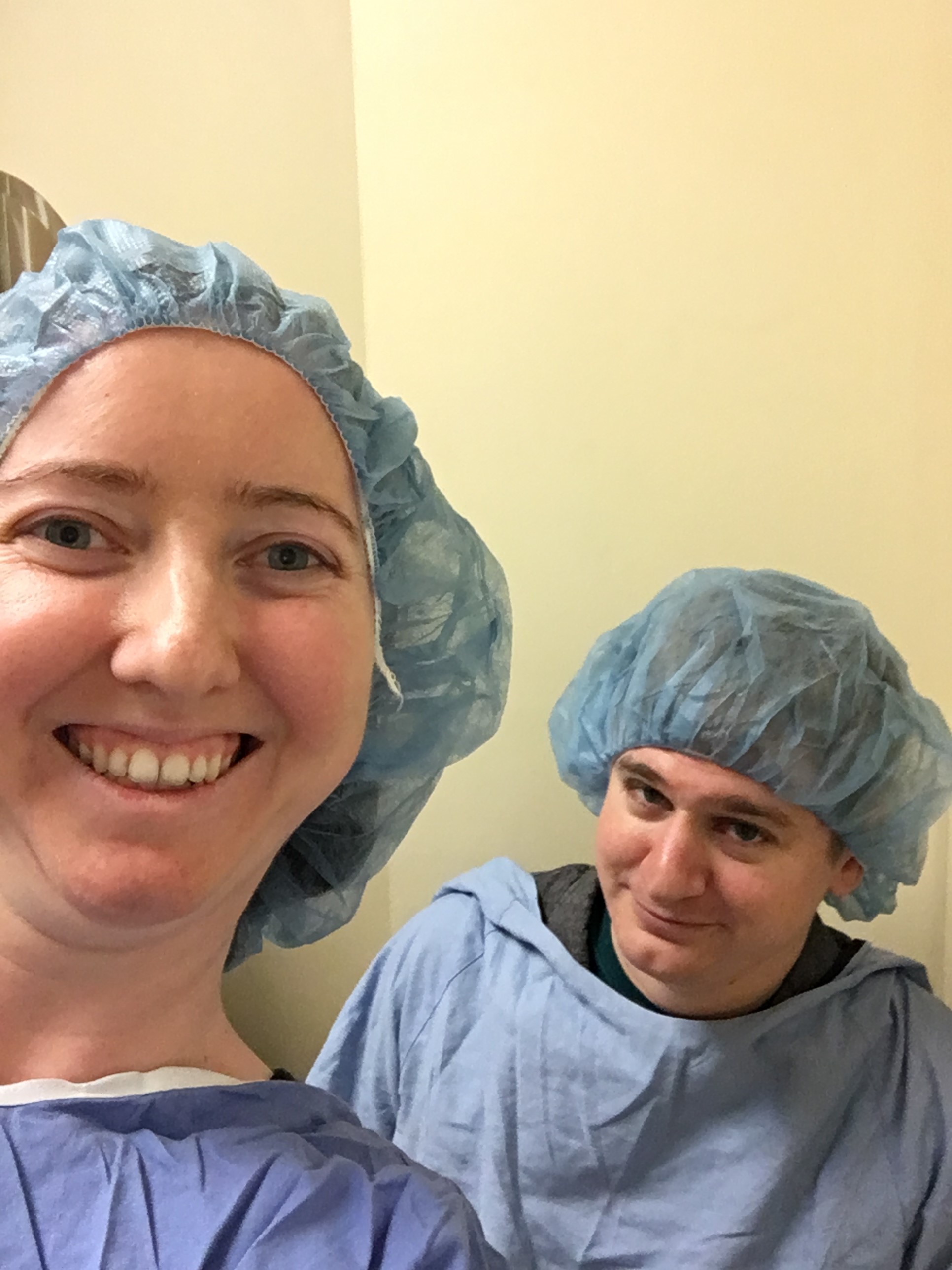 We both get hospital gowns, booties and lovely hats! We’re ready to go! Too bad the doctor isn’t!! He was on an international conference call, which meant we had to wait around for him to finish. With a full bladder.