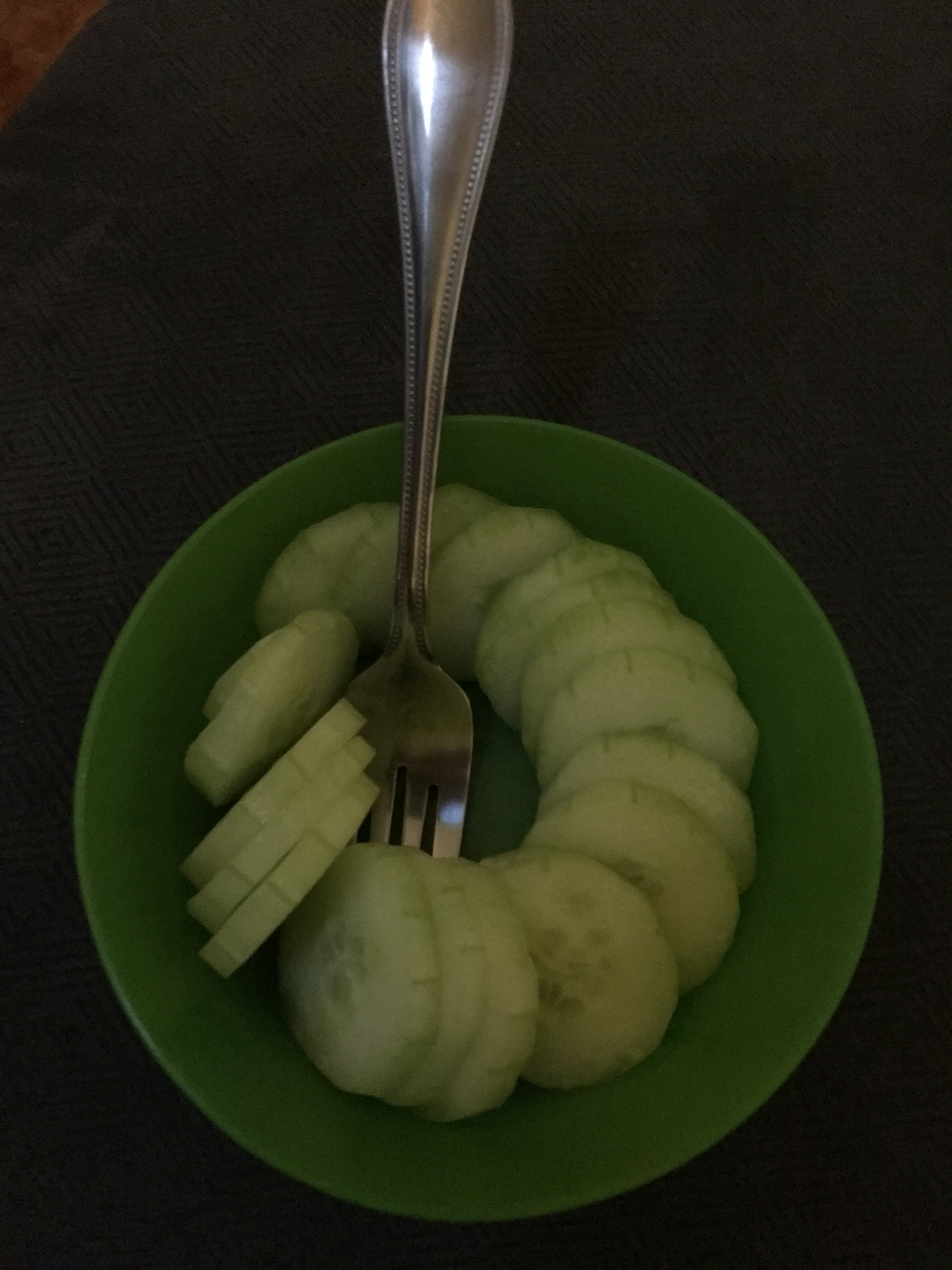 Because it is so close to Christmas, I didn’t want to inconvenience my mom by asking her to come up for my 48 hours of bedrest, which end on the morning of Christmas Eve. That means that David is in charge of taking care of me. He made a lovely lunch of mac-n-cheese with spam, broccoli and mushrooms. After lunch I had a nice nap to sleep off the valium. Later he made me a snack of cucumbers. And dinner obviously, but that didn’t get photographed.